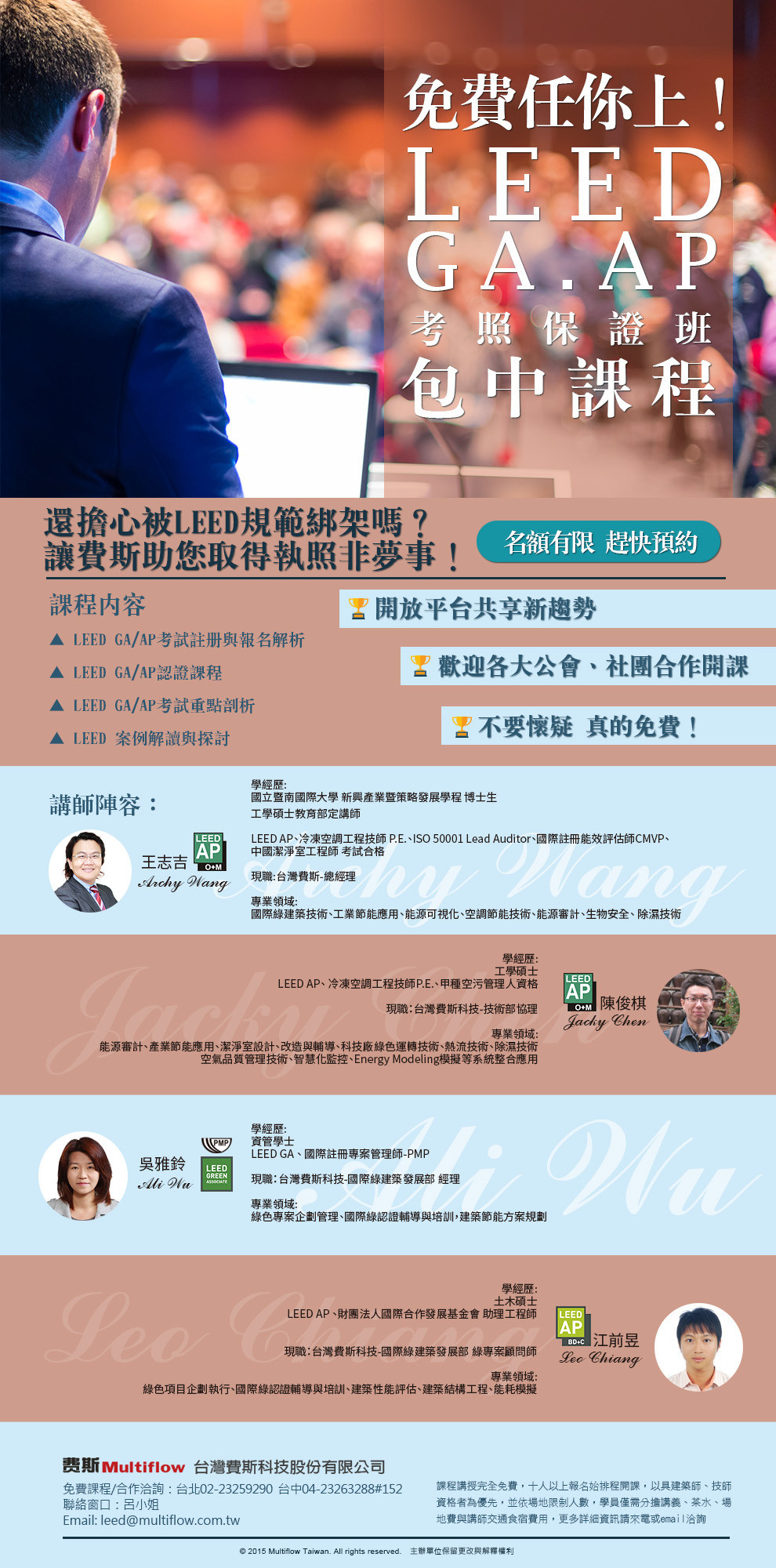 想考取LEED GA /AP證照卻覺得無從著手或課程昂貴?現在費斯綠建築發展部提供您一個好機會,基於綠色認證、綠色產業的市場發展及需求,費斯認為打造一個開放共享的平台,培育更多人才參與綠色大未來,創造屬於你我的共享永續價值才是未來趨勢,故不惜成本展開免費綠人才培育課程計畫,讓我們一起尋求綠色發展的更多可能性!